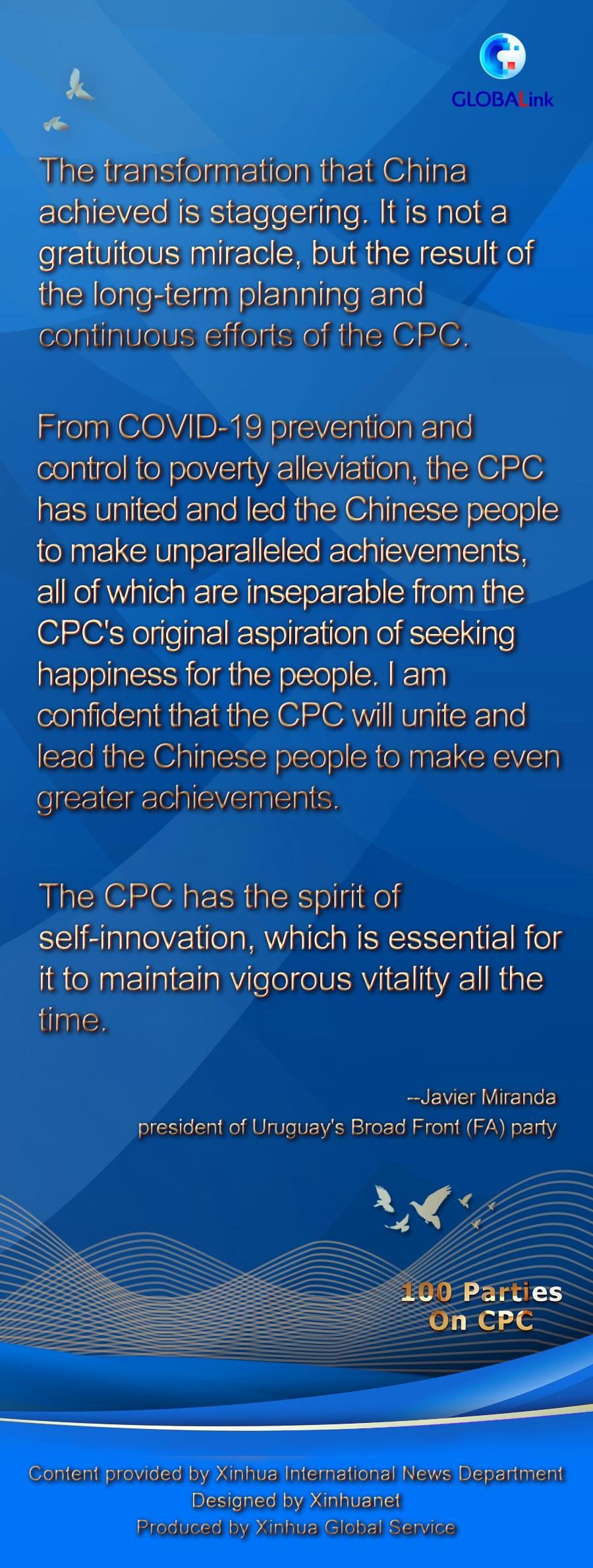 "From COVID-19 prevention and control to poverty alleviation, the CPC has united and led the Chinese people to make unparalleled achievements, all of which are inseparable from the CPC's original aspiration of seeking happiness for the people. I am confident that the CPC will unite and lead the Chinese people to make even greater achievements," Miranda said.
