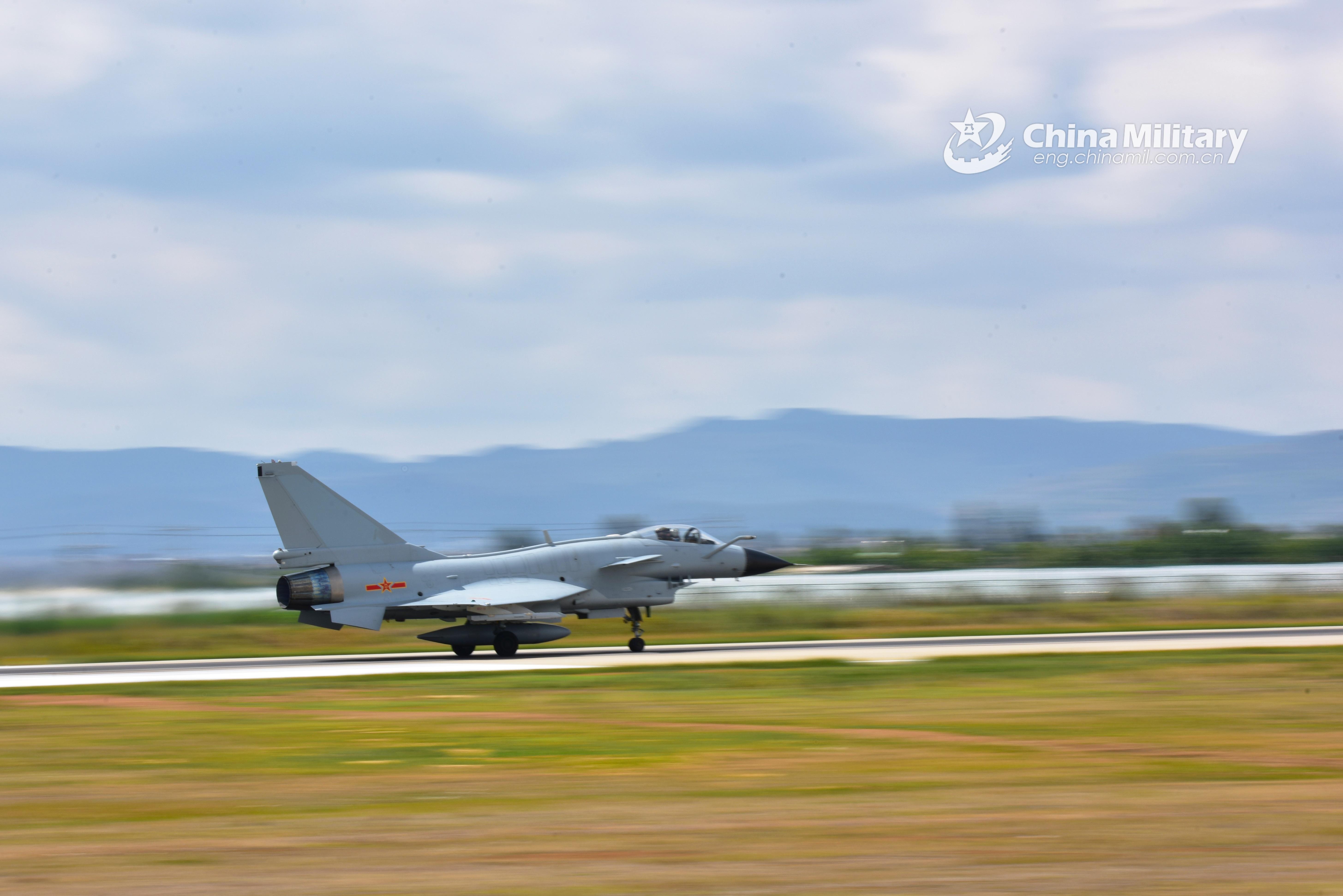 A fighter jet attached to an aviation brigade of the air force under the PLA Southern Theater Command takes off during a recent 24-hour flight training exercise. (eng.chinamil.com.cn/Photo by Zhang Xuemin)
