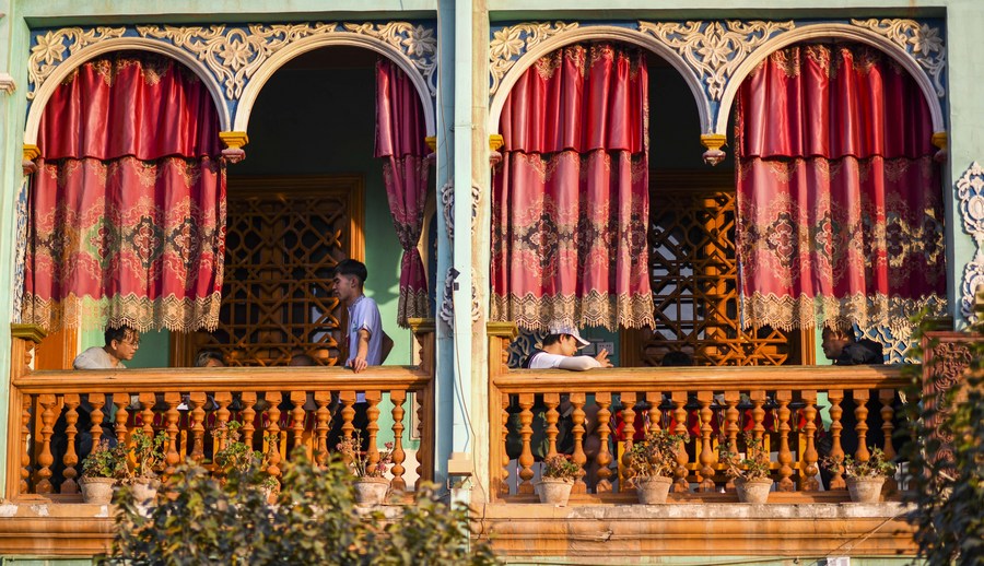 Tourists are seen at a teahouse in the ancient city of Kashgar, northwest China's Xinjiang Uygur Autonomous Region, Sept. 22, 2020. (Xinhua/Zhao Ge)
