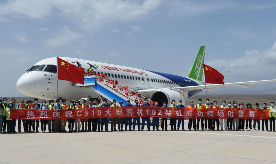 People pose for a photo in front of a C919 large passenger aircraft at the Turpan Jiaohe Airport in Turpan, northwest China's Xinjiang Uygur Autonomous Region, June 28, 2020. (Photo by Liu Jian/Xinhua)
