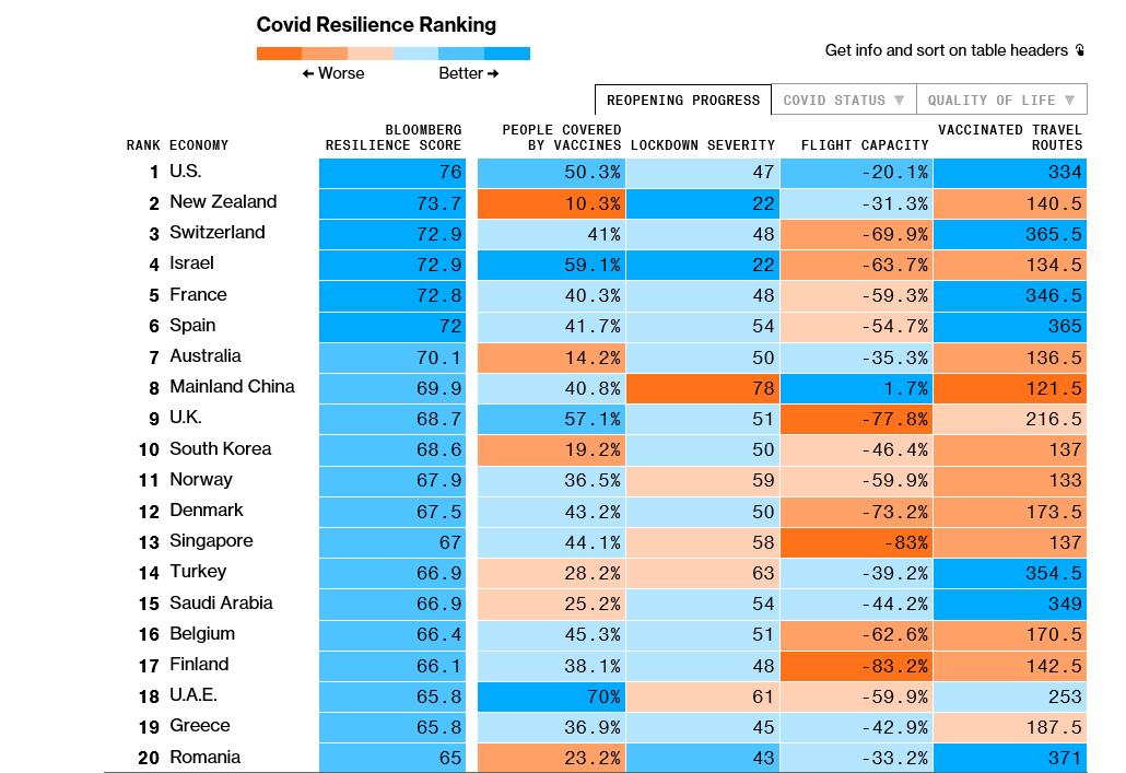 Screenshot of Bloomberg’s latest edition of the Covid Resilience Ranking