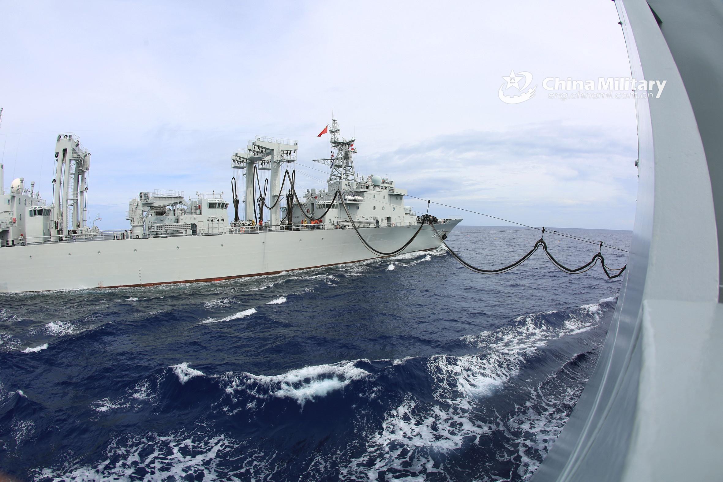 The comprehensive supply ship attached to the navy under the PLA Southern Theater Command provides supplies to a guided-missile frigate during a recent realistic far-sea training exercise. The training exercise mainly focused on such subjects as live-fire operation, air-defense, anti-missile, and replenishment-at-sea. (eng.chinamil.com.cn/Photo by Xue Chengqing)