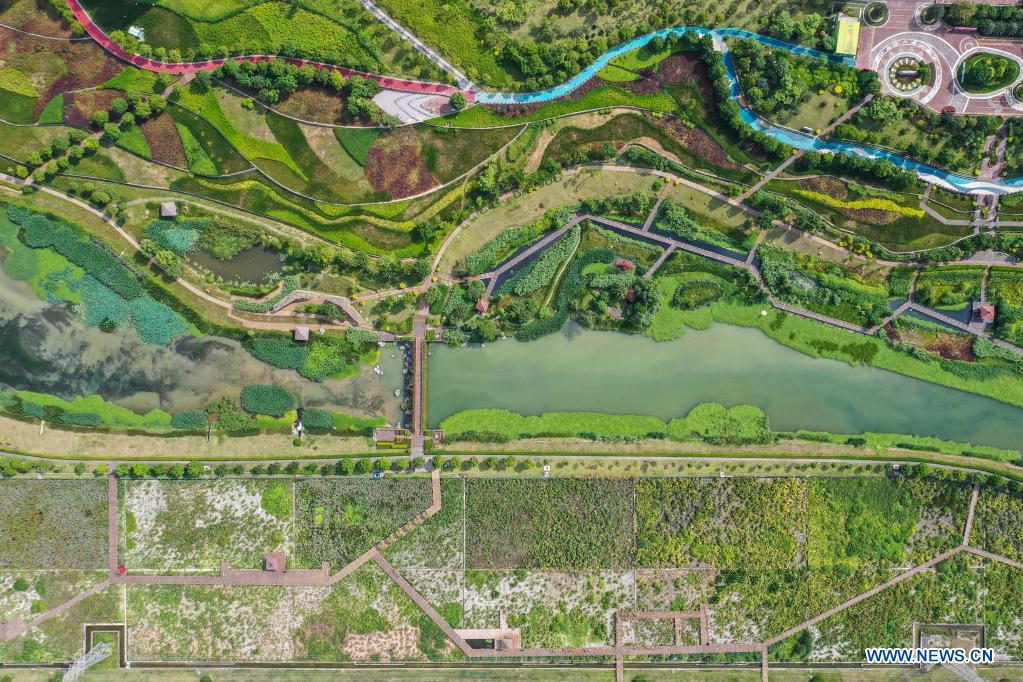 Aerial photo taken on July 11, 2021 shows the Nakao River wetland park in Nanning, south China's Guangxi Zhuang Autonomous Region. Nakao River in Nanning was once a polluted muddy gutter lined with sewage outlets. In 2015, a public-private partnership (PPP) project was rolled out to improve the ecological environment along the river. Pollution control measures including sewage interception and treatment, as well as aquatic ecosystem restoration, have helped turn the river into a wetland park with lucid waters. (Xinhua/Cao Yiming)