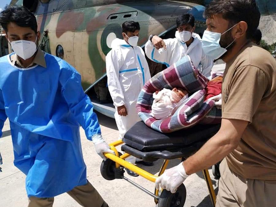 Photo taken with a mobile phone shows people transferring an injured person to a hospital following a blast in Gilgit city, Pakistan's northwest Khyber Pakhtunkhwa province, July 14, 2021. (Str/Xinhua)