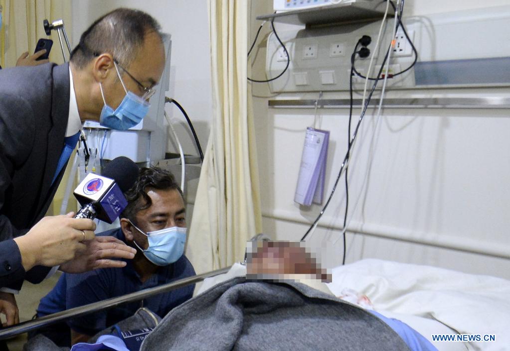 Chinese Ambassador to Pakistan Nong Rong (L) talks with an injured Chinese national at the Combined Military Hospital in Rawalpindi of Pakistan's Punjab province on July 14, 2021. Chinese Ambassador to Pakistan Nong Rong, accompanied by Pakistani Foreign Secretary Sohail Mahmood, visited the injured Chinese nationals from a blast at the Combined Military Hospital in Rawalpindi on Wednesday night. (Photo by Ahmad Kamal/Xinhua)