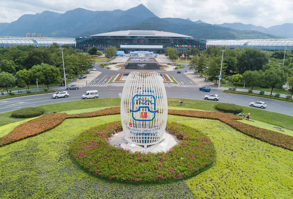 Aerial photo taken on July 15, 2021 shows a flowerbed in front of the Fuzhou Strait International Conference &Exhibition Center, the main venue for the upcoming 44th session of the World Heritage Committee of UNESCO, in Fuzhou, capital of southeast China's Fujian Province. The 44th session of the World Heritage Committee of UNESCO will open on July 16 in Fuzhou. (Xinhua/Song Weiwei)