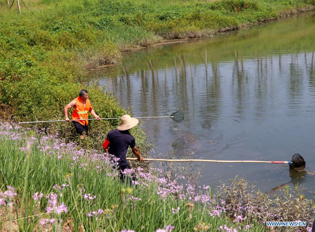 Members of a watercourse patrol team clean the Hangu section of Liangtan River in southwest China's Chongqing, July 14, 2021. The water quality and ecosystem of Liangtan River in Chongqing has been improved in recent years thanks to the city's ecological restoration efforts. (Photo by Hu Shuangyue/Xinhua)