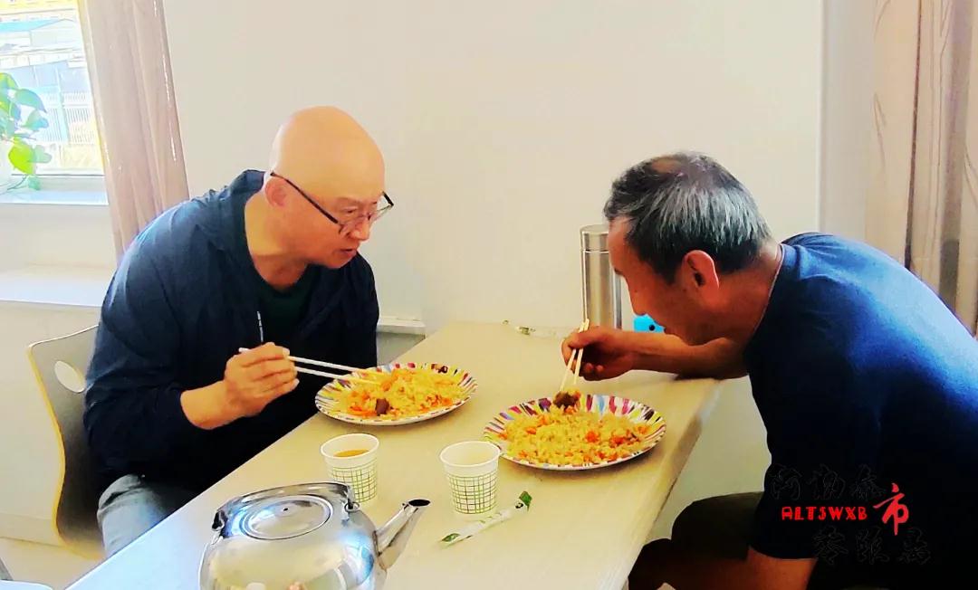 Two local residents have a meal in a community canteen in Altay, Xinjiang Uygur autonomous region. (Photo/altxw.com)