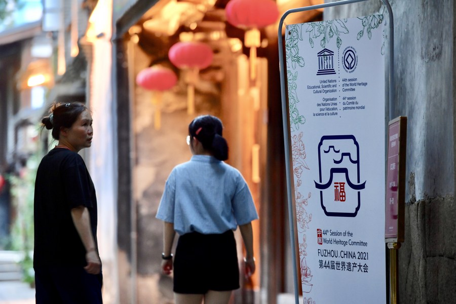 People watch a poster about the 44th session of the World Heritage Committee of UNESCO at Zhuzifang Block in Fuzhou, southeast China's Fujian Province, July 14, 2021. (Xinhua/Jiang Kehong)