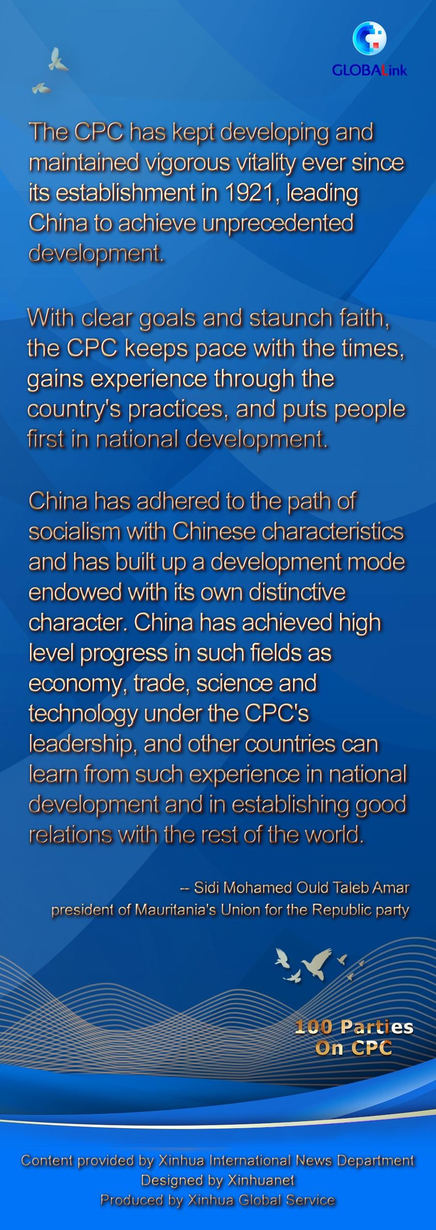 NOUAKCHOTT, July 16 (Xinhua) -- The Communist Party of China (CPC) has kept developing and maintained vigorous vitality ever since its establishment in 1921, leading China to achieve unprecedented development, Sidi Mohamed Ould Taleb Amar, president of Mauritania's ruling Union for the Republic party, has said.