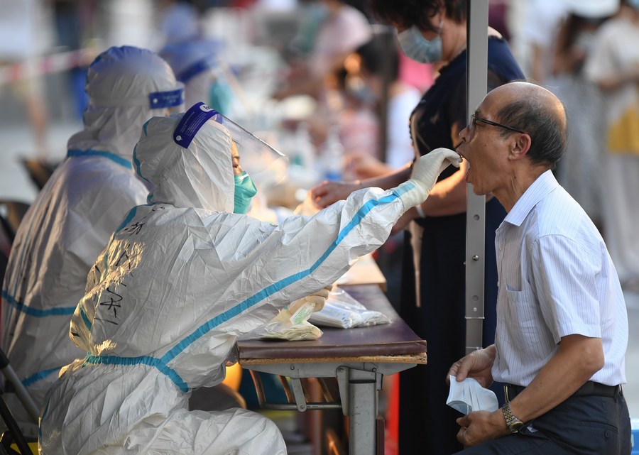 A medical worker collects a swab sample for nucleic acid test in Ruili City of southwest China's Yunnan Province, July 8, 2021. (Xinhua/Wang Guansen)