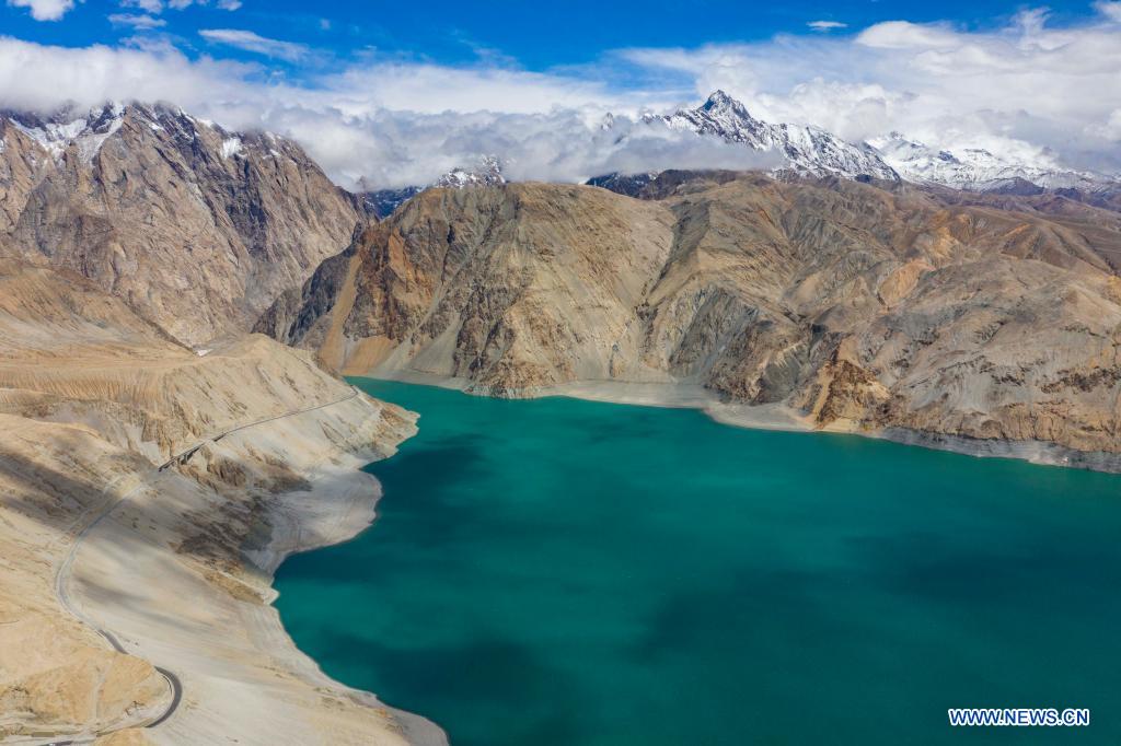 Aerial photo taken on May 13, 2021 shows a view of the Xiabandi reservoir, a key water conservancy project in the Pamirs, northwest China's Xinjiang Uygur Autonomous Region. Adhering to a "people-centered" philosophy of development, Xinjiang has witnessed a brisk growth in its economy and social affairs. With steadily increasing input in projects for the public well-being, people of all ethnic groups now have equal opportunities to develop their careers, to contribute to regional construction, and to share a happy life and effectively ensured economic rights. (Xinhua/Hu Huhu)