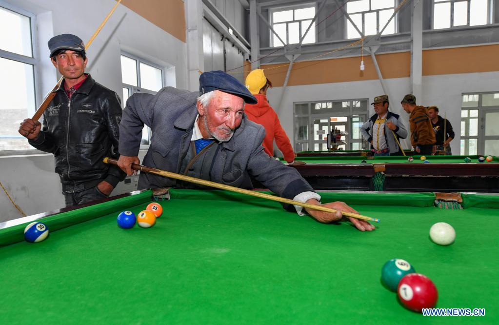 Residents play billiard at a relocation site for poverty alleviation in Tajik Autonomous County of Taxkorgan, northwest China's Xinjiang Uygur Autonomous Region, May 22, 2020. Adhering to the "people-centered" philosophy of development, Xinjiang has witnessed a brisk growth in both its economy and social affairs. With steadily increased input in projects for public well-being, people of all ethnic groups now have equal opportunities to develop their careers, to contribute to regional construction, and to share a happy life and effectively ensured economic rights. (Xinhua/Hu Huhu)