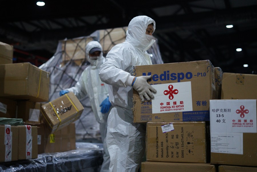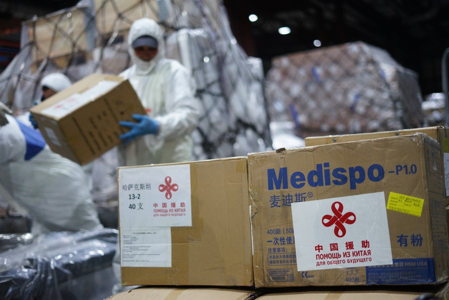Workers transfer medical supplies from China in a warehouse at the Almaty International Airport in Almaty, Kazakhstan, April 2, 2020. (Kursiv Newspaper/Handout via Xinhua)