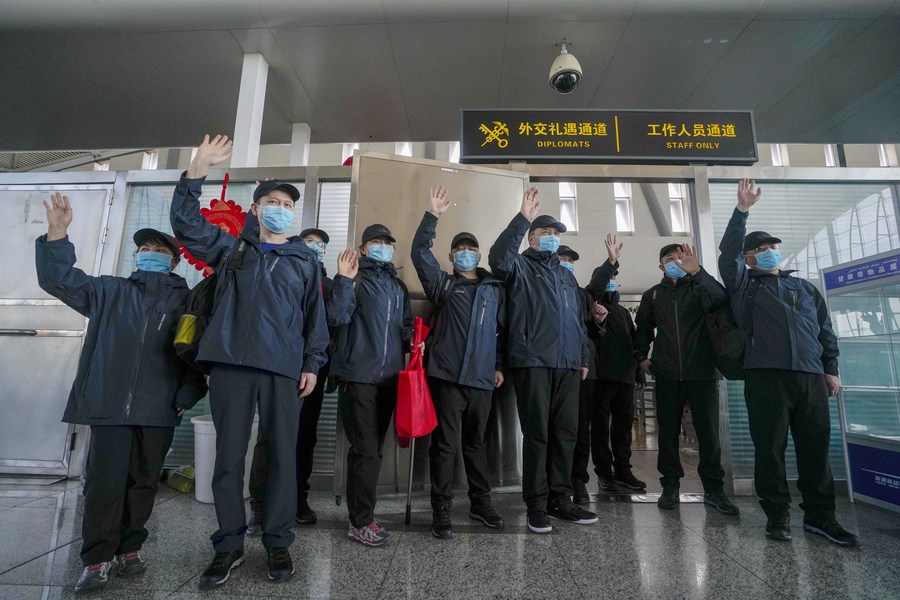 Medical team members gather at Diwopu International Airport in Urumqi, northwest China's Xinjiang Uygur Autonomous Region, April 9, 2020. (Xinhua/Zhao Ge)