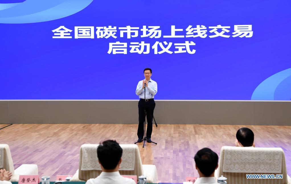 BEIJING, July 16 (Xinhua) -- Chinese Vice Premier Han Zheng attended a ceremony initiating the trading in the national carbon market Friday in Beijing.