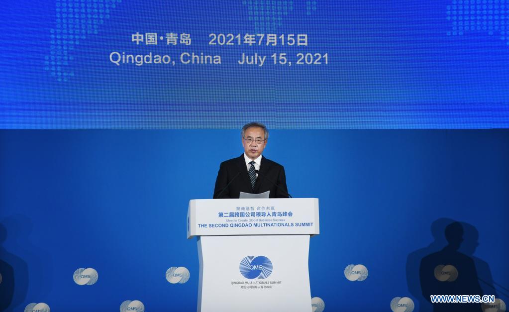 Chinese Vice Premier Hu Chunhua, also a member of the Political Bureau of the Communist Party of China Central Committee, attends the opening ceremony of the second Qingdao Multinationals Summit in Qingdao, east China's Shandong Province, July 16, 2021. (Xinhua/Li Ziheng)
