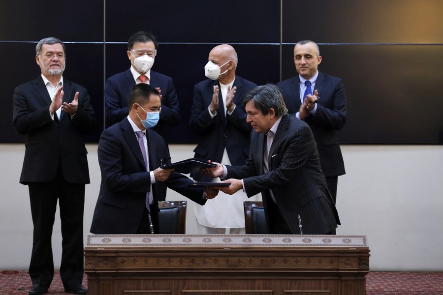 Afghan President Mohammad Ashraf Ghani (3rd R) applauds as representatives of the Afghan government and Chinese company MCC 19 exchange documents in Kabul, Afghanistan, Sept. 22, 2020. (Afghan Presidential Palace/Handout via Xinhua)