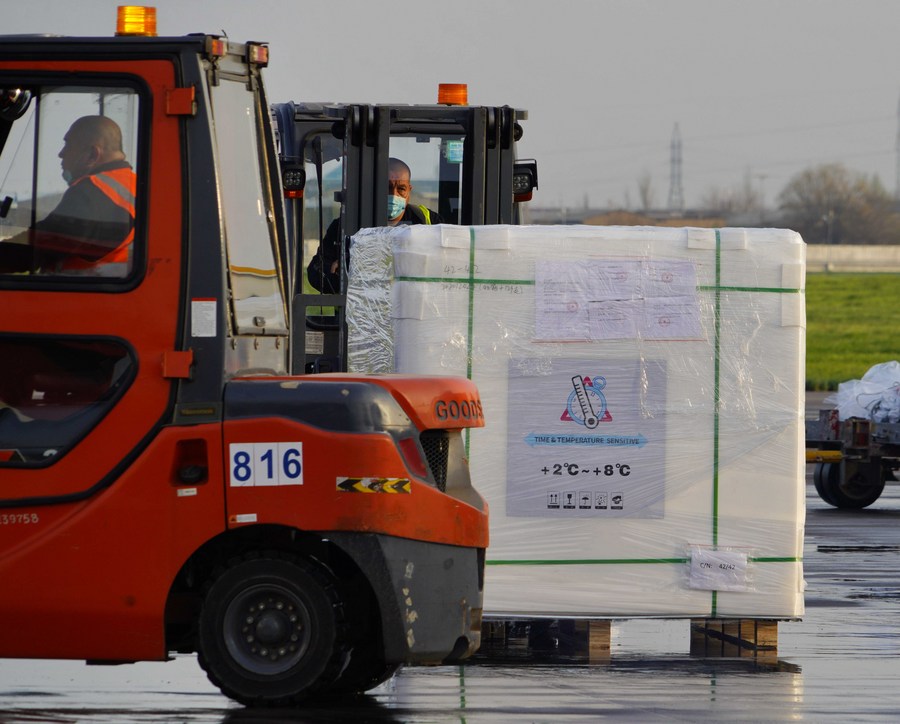 Workers transfer COVID-19 vaccines at Tashkent International Airport in Tashkent, Uzbekistan, on March 27, 2021. (Photo by Zafar Khalilov/Xinhua)