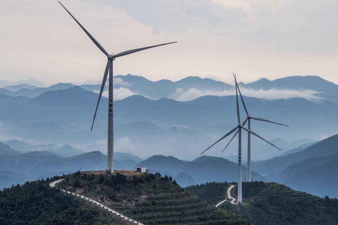 Photo taken on July 10, 2021, shows a wind farm in Panfeng township, Pan’an county, Jinhua city, east China’s Zhejiang province. (Photo by Chen Yueming/People’s Daily Online)