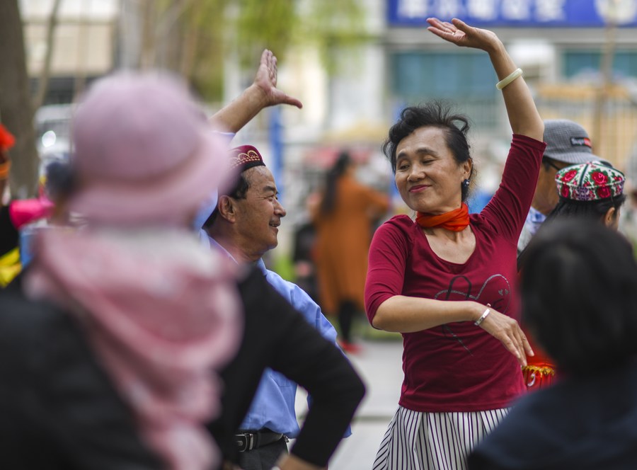 People dance at the People's Square in Korla, northwest China's Xinjiang Uygur Autonomous Region, April 10, 2019. (Xinhua/Zhao Ge)