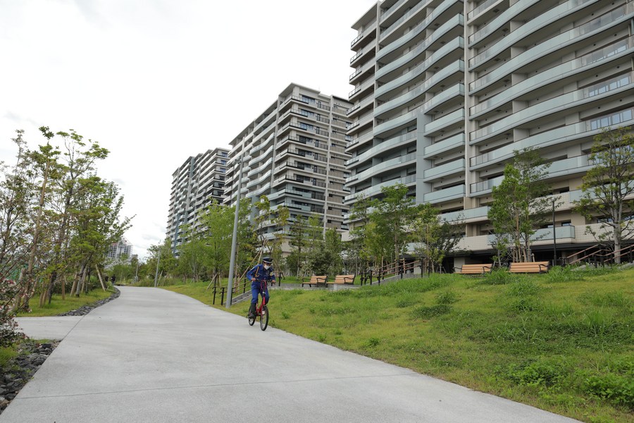 A security guard patrols inside the Tokyo 2020 Olympic Village. (Xinhua/Wang Zijiang)