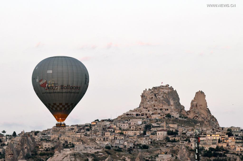 A hot-air balloon flies over Cappadocia, Turkey, on July 18, 2021. (Photo by Mustafa Kaya/Xinhua)