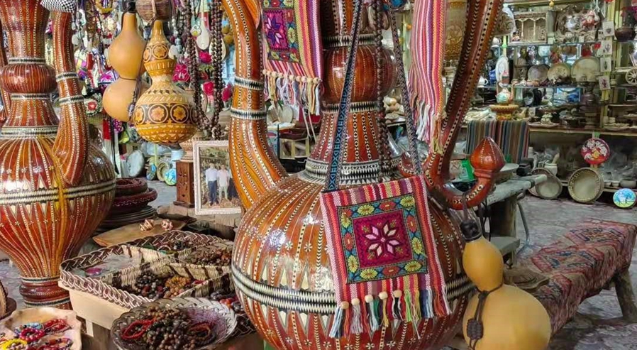 Wooden handicrafts found on shelves in souvenir shops in Kashgar’s old city reveal Uygur customs and offer a welcome sign to guests. (People’s Daily Online /Annemarie Li)