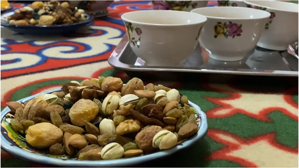 Tea with dried fruits and nuts served at a famous traditional tea house in Kashgar’s ancient quarter. (People’s Daily Online/Annemarie Li)