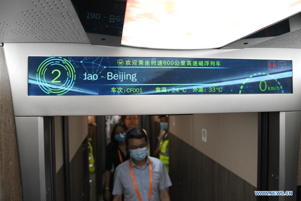 Visitors experience for themselves inside a cabinet of China's new high-speed maglev train in Qingdao, east China's Shandong Province, July 20, 2021. China's new high-speed maglev train rolled off the production line on Tuesday. It has a designed top speed of 600 km per hour -- currently the fastest ground vehicle available globally. The new maglev transportation system made its public debut in the coastal city of Qingdao, east China's Shandong Province. It has been self-developed by China, marking the country's latest scientific and technological achievement in the field of rail transit, according to the China Railway Rolling Stock Corporation. (Xinhua/Li Ziheng)