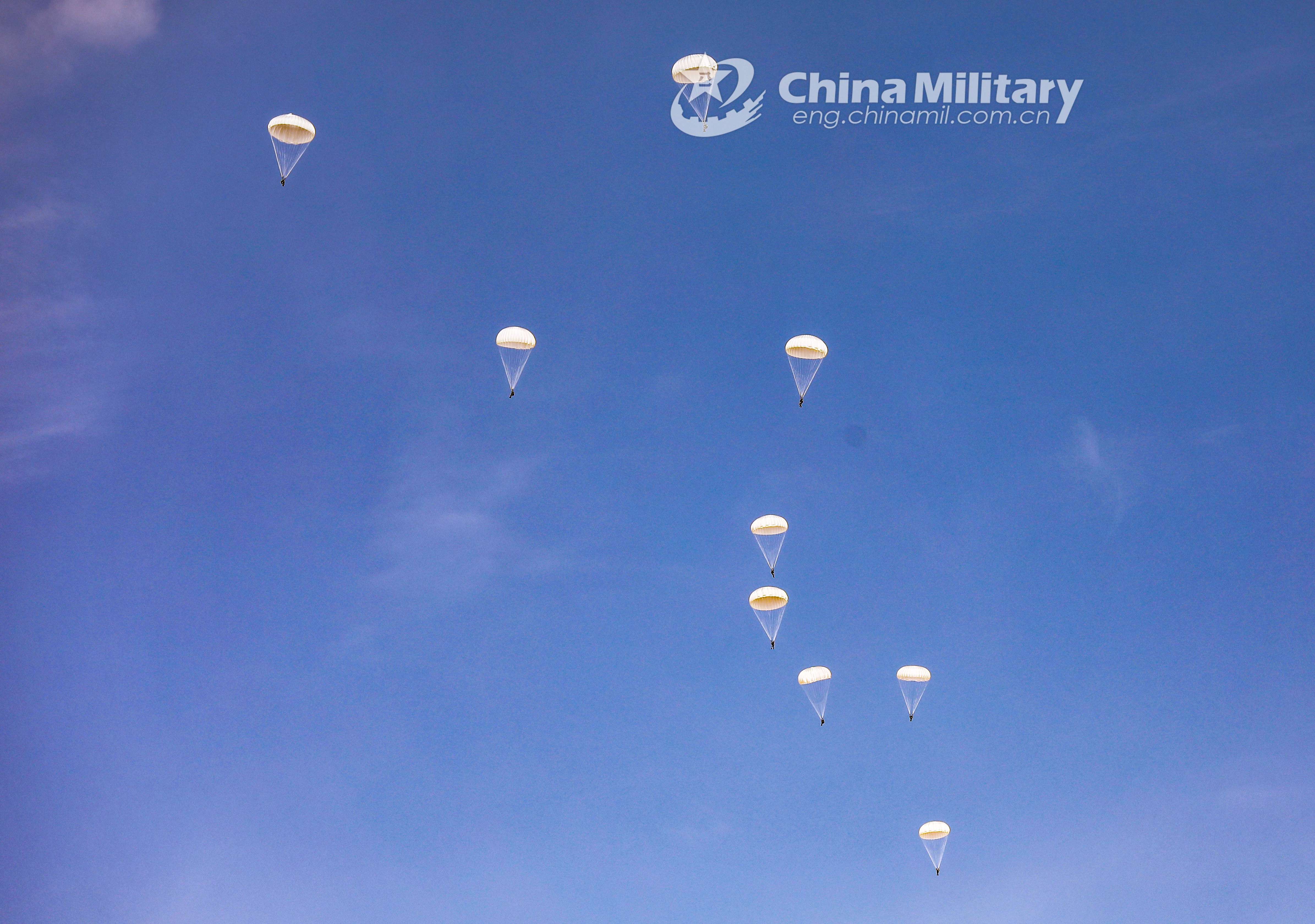 Paratroopers assigned to a brigade of the PLA Air Force’s airborne troops descend to the ground after jumping out of a transport aircraft during a recent massive airborne assault training operation on July 3, 2021. (eng.chinamil.com.cn/Photo by Yang Jielin)