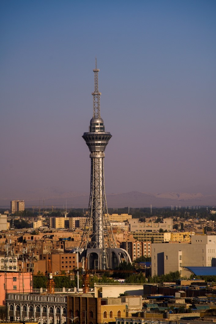 In China’s far west and in the southwestern sub-region of the Xinjiang Uyghur Autonomous Region, rising above the urban skyline and in view of its old city, stands Kashgar’s new TV tower, a space-grey metallic structure whose futuristic features form a stark contrast with the densely packed network of bare earthen mud-brick buildings and labyrinthine alleyways perched atop the ancient hillside below.