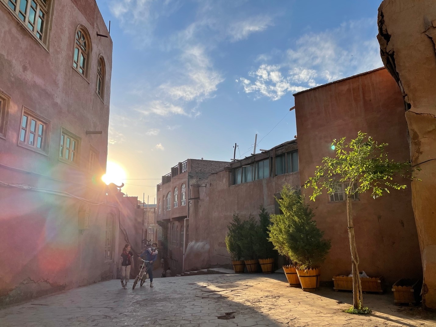 Another day dawns on the mud-brick fa?ades of traditional low-rise dwellings as schoolchildren frolic about along the winding corridors of the renovated historic old quarter of Kashgar City, Kashgar Prefecture, northwest China’s Xinjiang Uyghur Autonomous Region. (People’s Daily Online/Luke Witzaney)