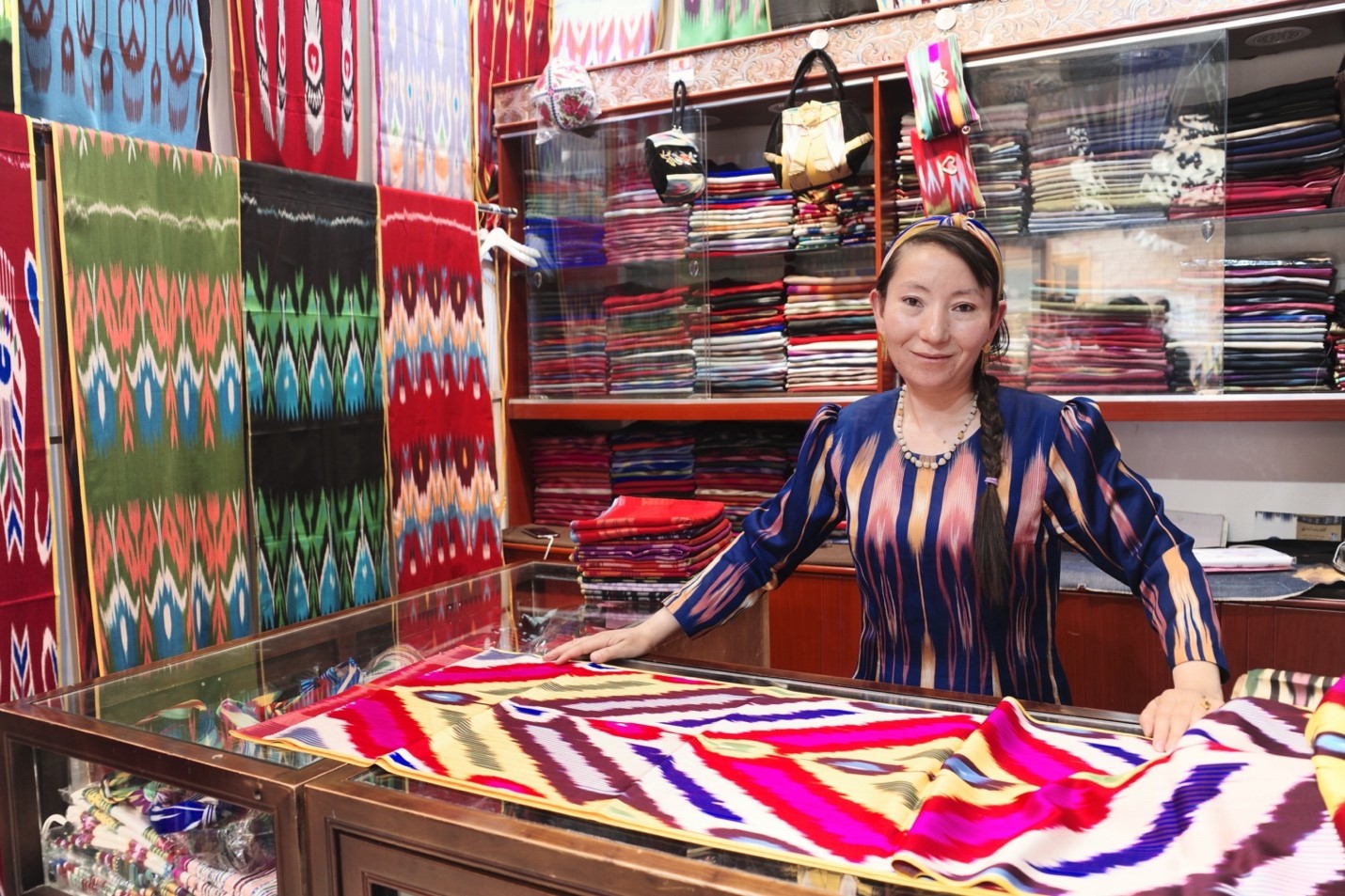 A local merchant showcases her Atlas silk fabrics in her brand-new shop situated along one of the popular pedestrian walkways in Tuancheng, a famous old district in Hotan City, Hotan Prefecture, northwest China’s Xinjiang Uyghur Autonomous Region. (People’s Daily Online/Kou Jie)