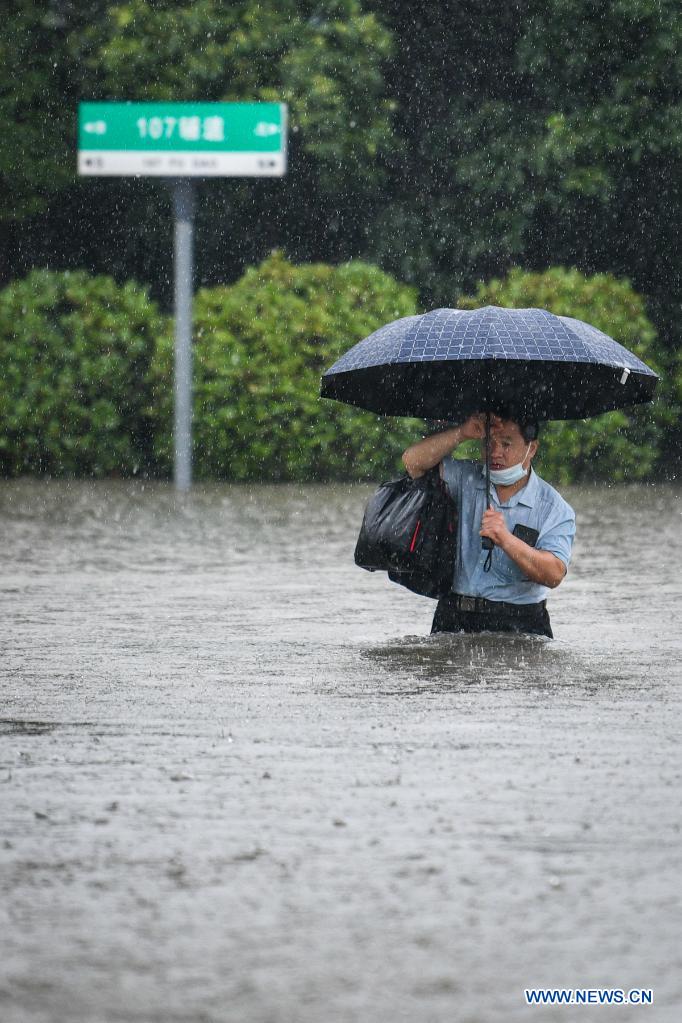 A man wades through a waterlogged road in Zhengzhou, capital of central China's Henan Province, July 20, 2021. More than 144,660 residents have been affected by torrential rains in central China's Henan Province since July 16, and 10,152 have been relocated to safe places, the provincial flood control and drought relief headquarters said Tuesday. A total of 16 large and medium-sized reservoirs have seen water levels rise above the alert level after torrential rains battered most parts of the province on Monday and Tuesday. (Photo by Hou Jianxun/Xinhua)