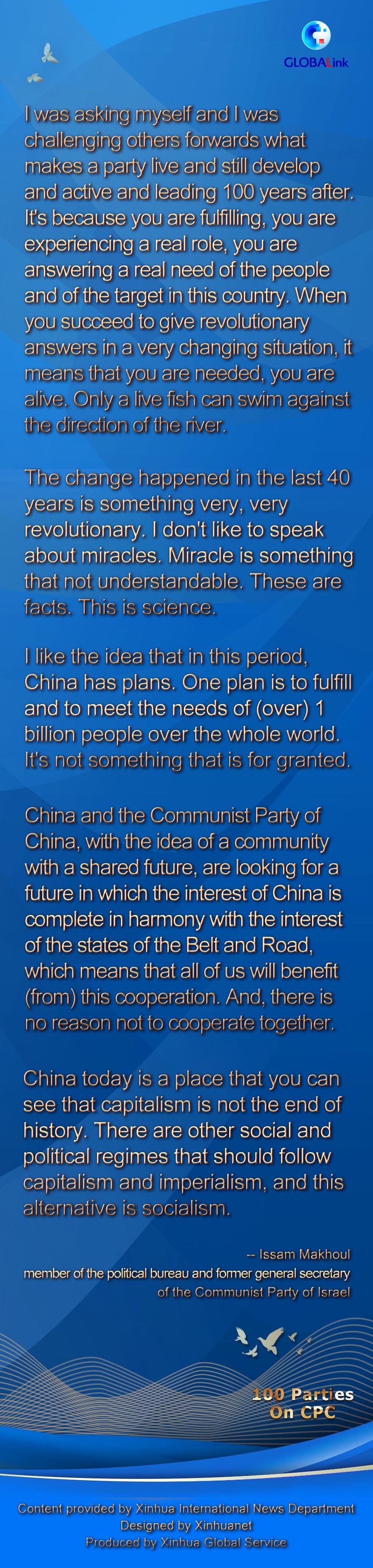 JERUSALEM, July 20 (Xinhua) -- The Communist Party of China (CPC) has been committed to satisfying the common needs and interests of the Chinese people, a key reason why the CPC is able to embrace its 100th anniversary with full confidence, said Issam Makhoul, member of the political bureau and former general secretary of the Communist Party of Israel.