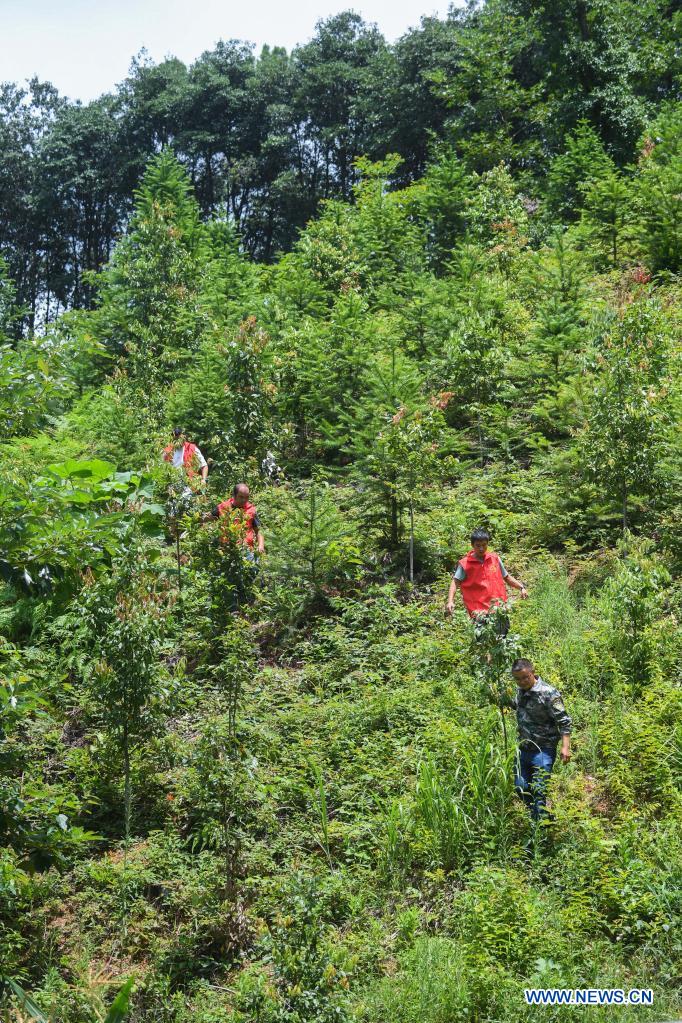 Volunteers patrol a forest area in Shangyang Village of Taihuyuan Township in Hangzhou, capital of east China's Zhejiang Province, July 20, 2021. The forest area covering some 22 hectares was launched in 2017 aiming to help reduce carbon dioxide emissions and achieve carbon neutrality. (Xinhua/Xu Yu)