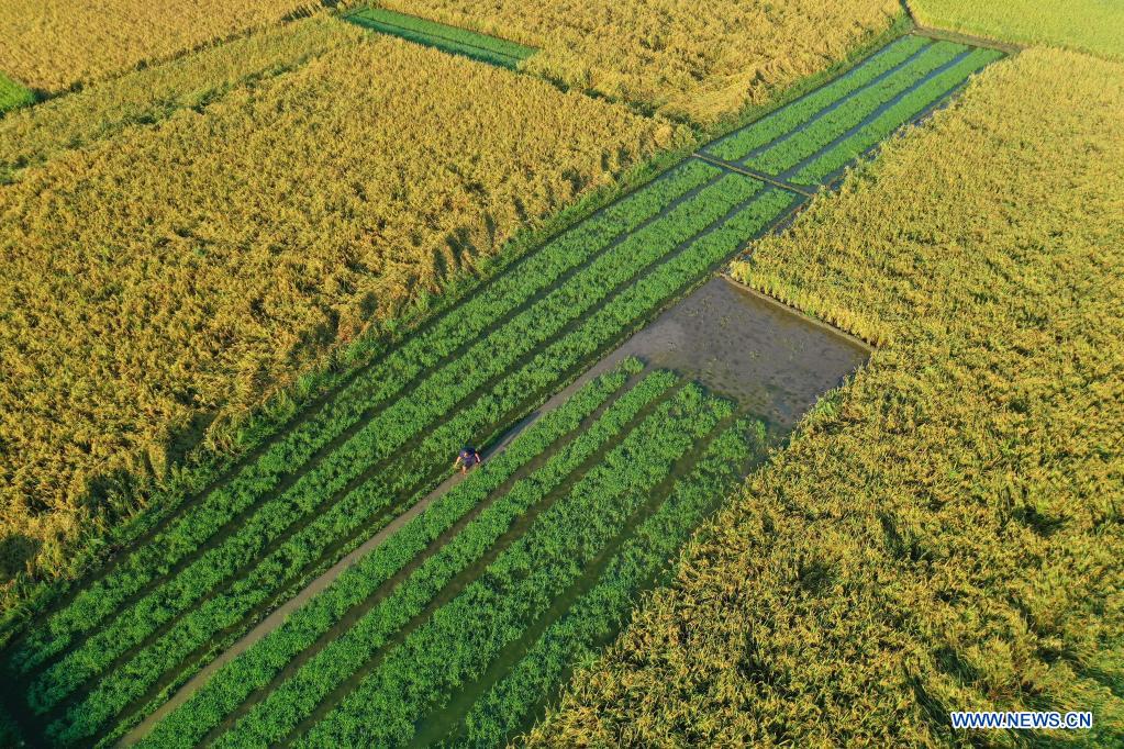 Aerial photo taken on July 20, 2021 shows a farmer working in the field in Baishizhai Village, Shouyan Township, Daoxian County of Yongzhou City, central China's Hunan Province. (Photo by He Hongfu/Xinhua)