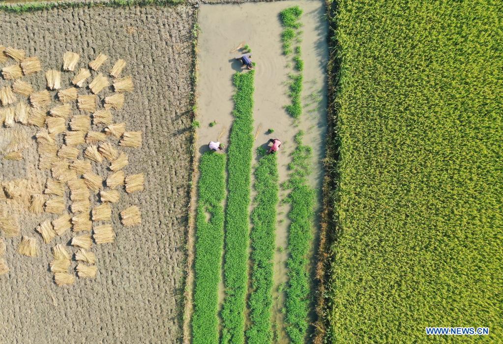 Aerial photo taken on July 20, 2021 shows farmers working in the field in Baishizhai Village, Shouyan Township, Daoxian County of Yongzhou City, central China's Hunan Province. (Photo by He Hongfu/Xinhua)