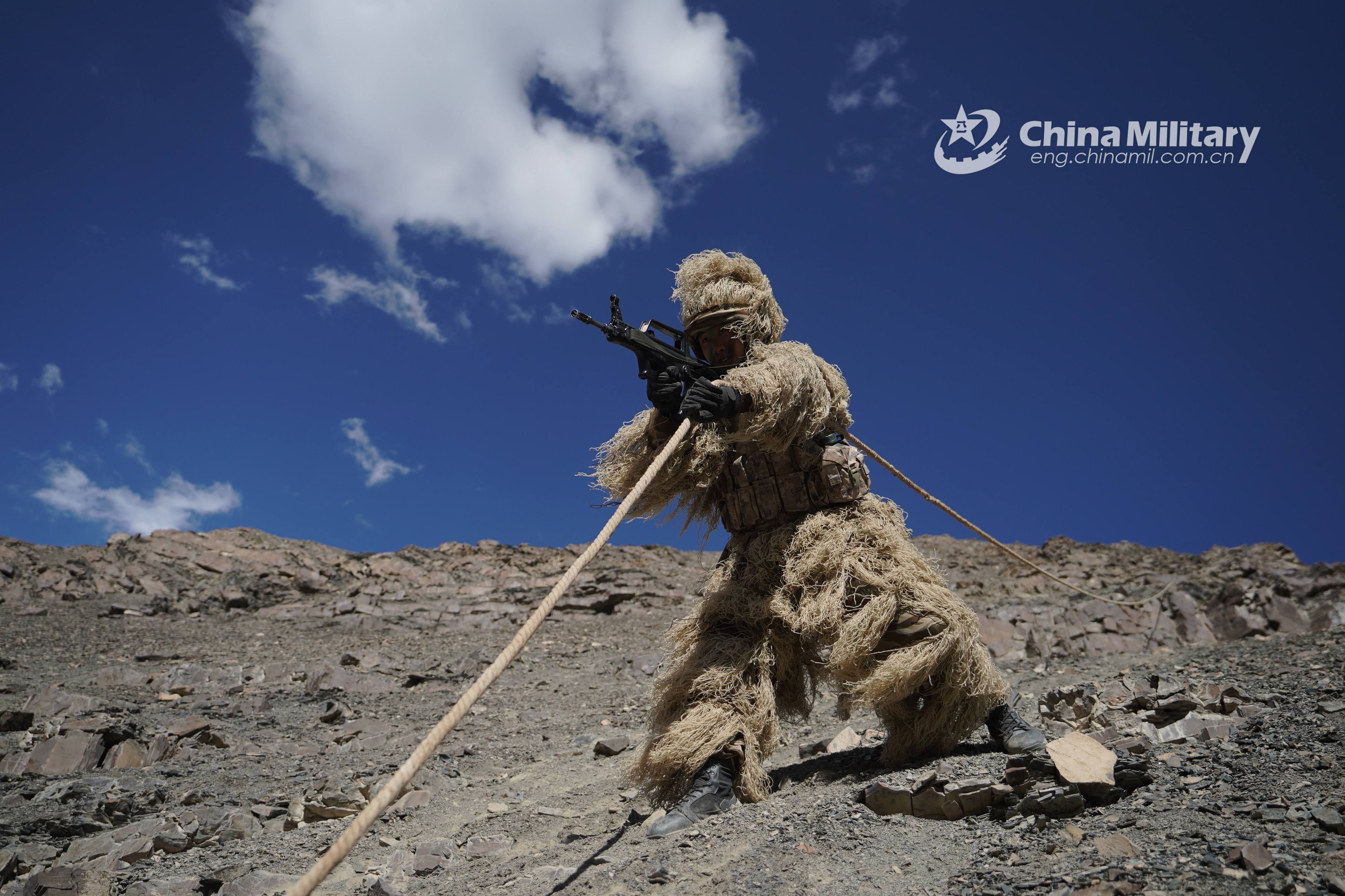 A soldier assigned to a combined arms regiment under the PLA Xinjiang Military Command rappels from the cliff in firing position with sniper rifle during a reconnaissance tactical training exercise in mid June, 2021. (eng.chinamil.com.cn/Photo by Xiang Liming)