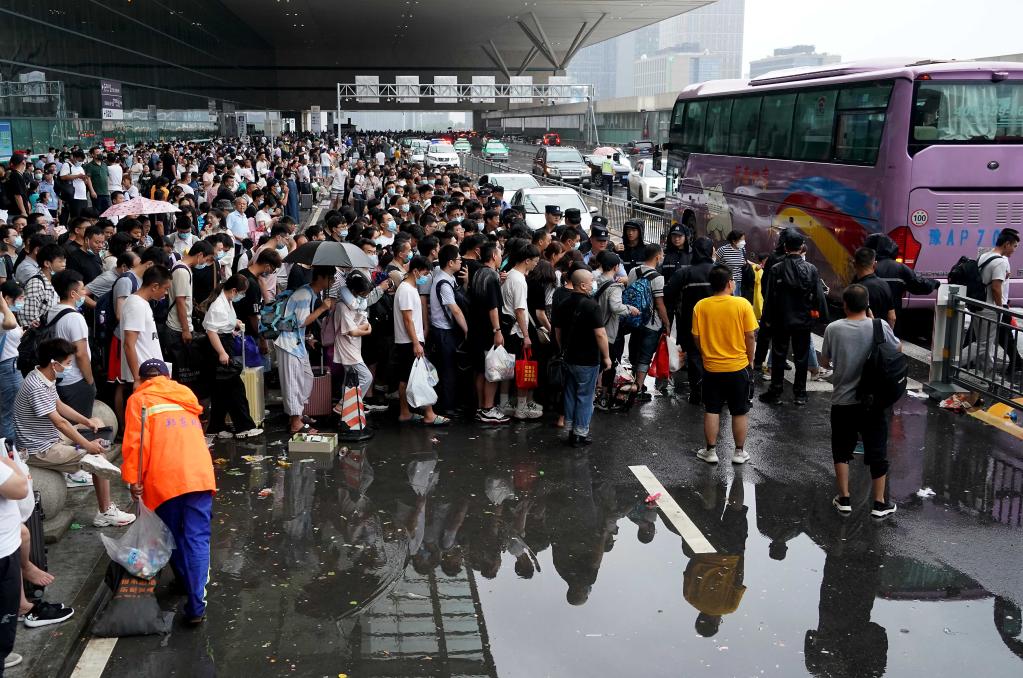 Stranded passengers queue to board a bus at the Zhengzhou East Railway Station in Zhengzhou, capital of central China's Henan Province, July 21, 2021. Zhengzhou has been lashed by record rainstorms. More than 160 trains stopped services at Zhengzhou East Railway Station stranding a large number of passengers. Buses have been dispatched to transfer stranded passengers to safety zone in urban district and the number of trapped people here has decreased significantly by Wednesday morning. Heavy rains in Henan are expected to last until Wednesday night, according to forecasts. (Xinhua/Li An)