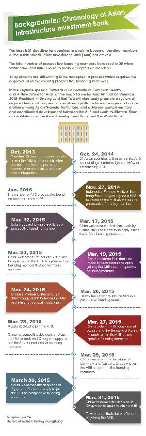 BEIJING , Apr. 01, 2015 (Xinhua) --The graphic shows the backgrounder about the chronology of Asian Infrastructure Investment Bank. (Xinhua) |