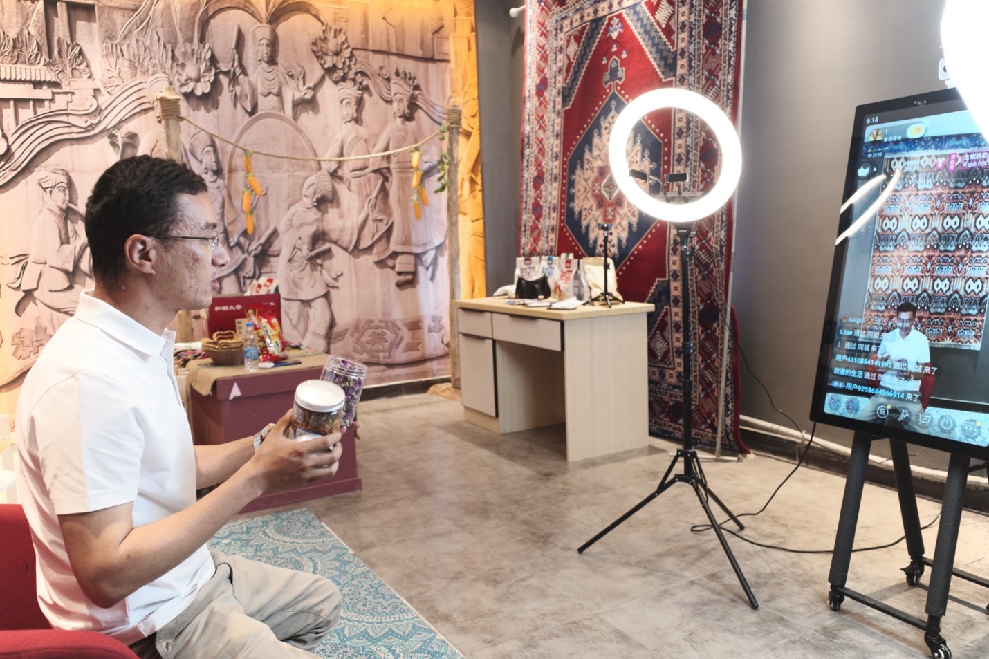 Ershat Ibrahim introduces locally produced rose tea to prospective buyers online at a regional e-commerce center in Hotan City, Hotan Prefecture, in northwest China’s Uyghur Autonomous Region. (People's Daily Online/Kou Jie)