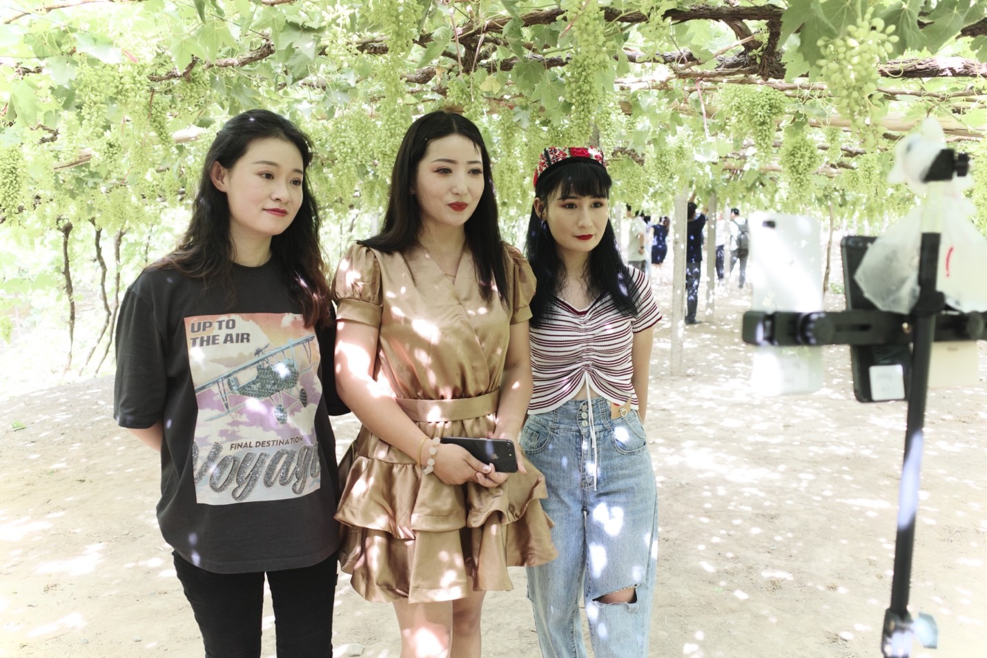Online influencers Zhu Huating (left), Aliye Ablimit (right), and Muqeddes Weli (center) stand inside a vineyard while reaching out to their followers from across the country during a livestreamed broadcast promoting fresh grapes grown locally in Turpan, northwest China’s Xinjiang Uyghur Autonomous Region. (People’s Daily Online/Kou Jie)