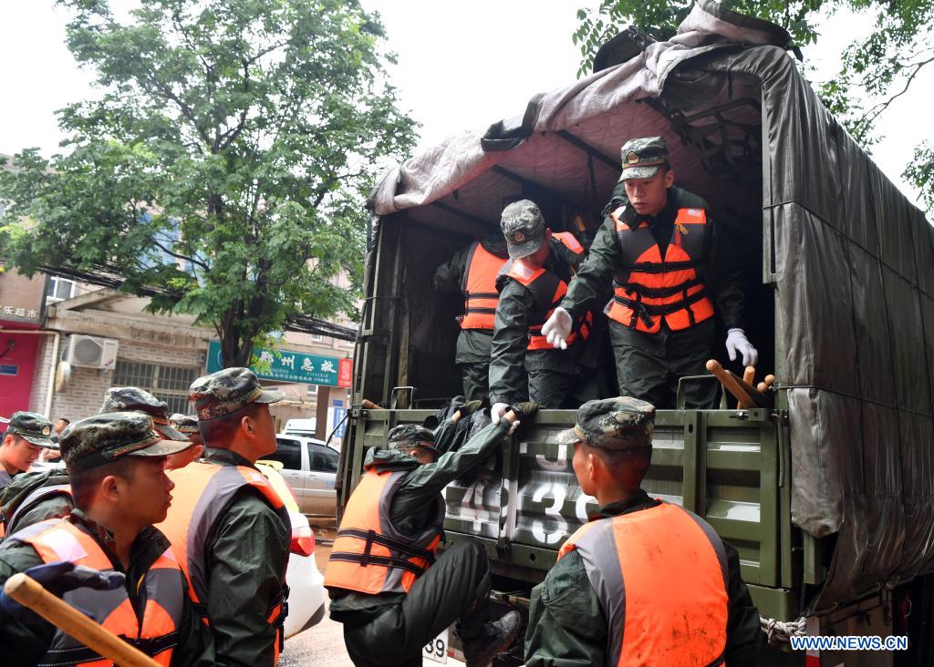 Armed police officers prepare to depart for rescue work in Mihe Town of Gongyi City, central China's Henan Province, July 21, 2021. Mihe Town suffered great damage due to the heavy rainfall on July 20, with a large number of roads damaged and vehicles flooded. (Xinhua/Li Jianan)