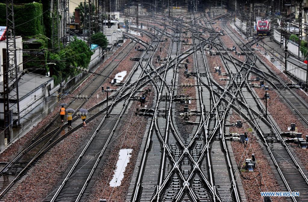 Staff members check rail tracks at Zhengzhou Railway Station in Zhengzhou, central China's Henan Province, July 21, 2021. Rainstorms have swamped central China's Henan Province since the weekend. (Xinhua/Zhu Xiang)