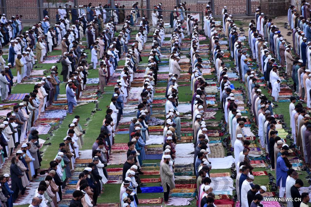 People pray during the Eid al-Adha festival in Karachi, Pakistan, July 21, 2021. (Str/Xinhua)