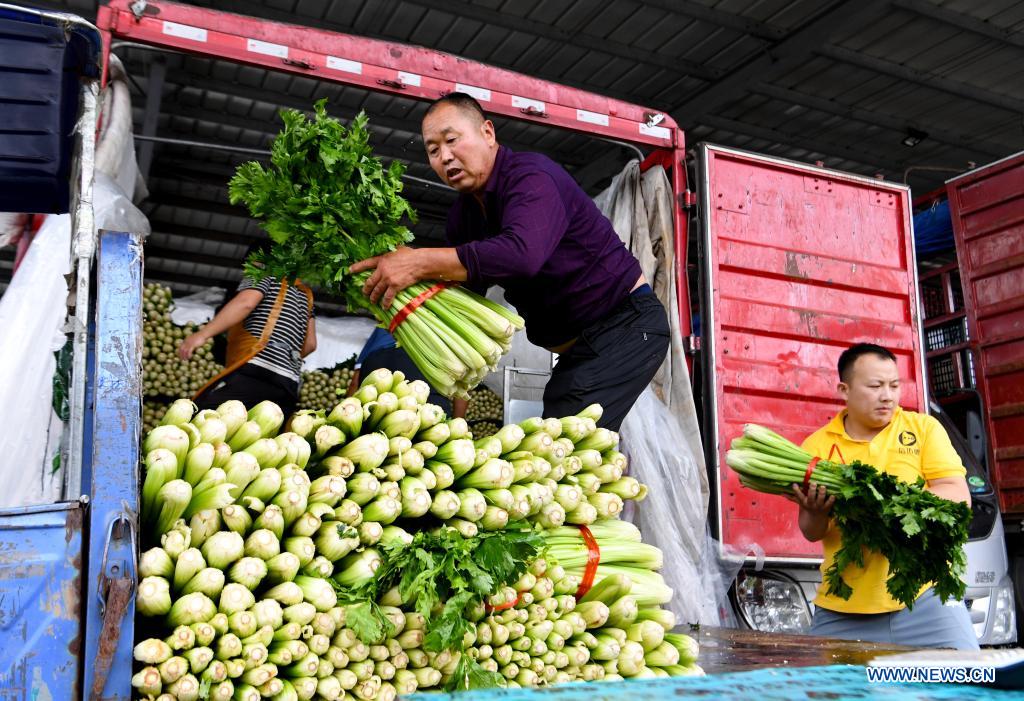 Staff members transfer vegetables at a logistic center in Zhongmu County of Zhengzhou, central China's Henan Province, July 22, 2021. Various measures have been taken to ensure supply of agricultural products in Zhengzhou, which was swamped by flood recently caused by heavy rainfall. At present, the supply of vegetables has been adequate with stable price. (Xinhua/Hao Yuan)