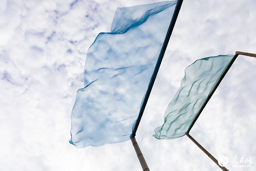 Photo shows fabrics colored with plant-based dyes dancing in the wind. (People’s Daily Online/Jiao Yan) |