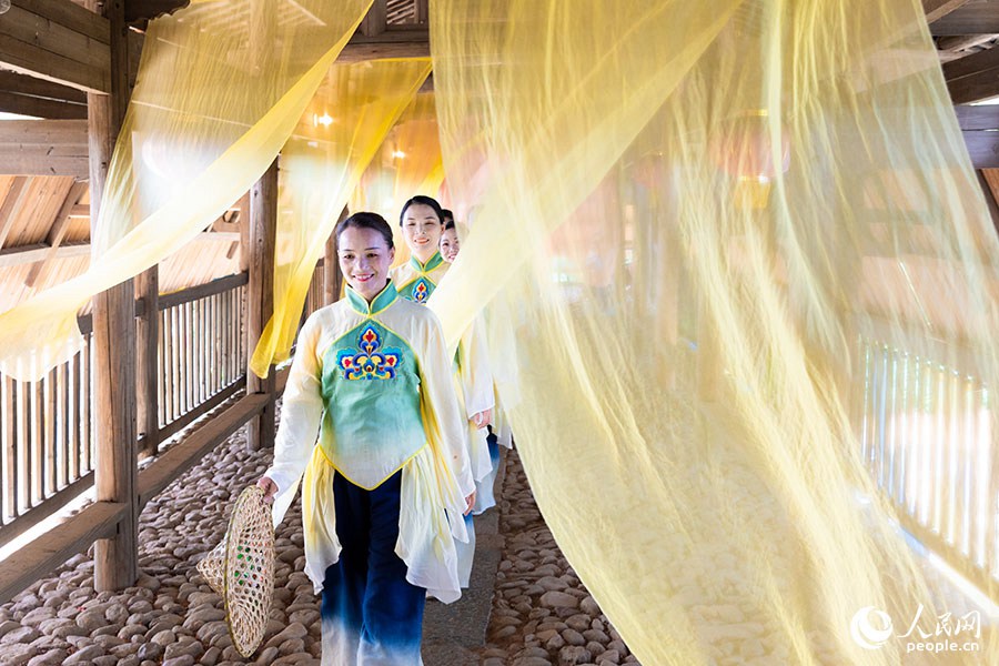 Photo shows a performance combining fabrics dyed in iridescent colors extracted from crop waste and dance. (People’s Daily Online/Jiao Yan) |